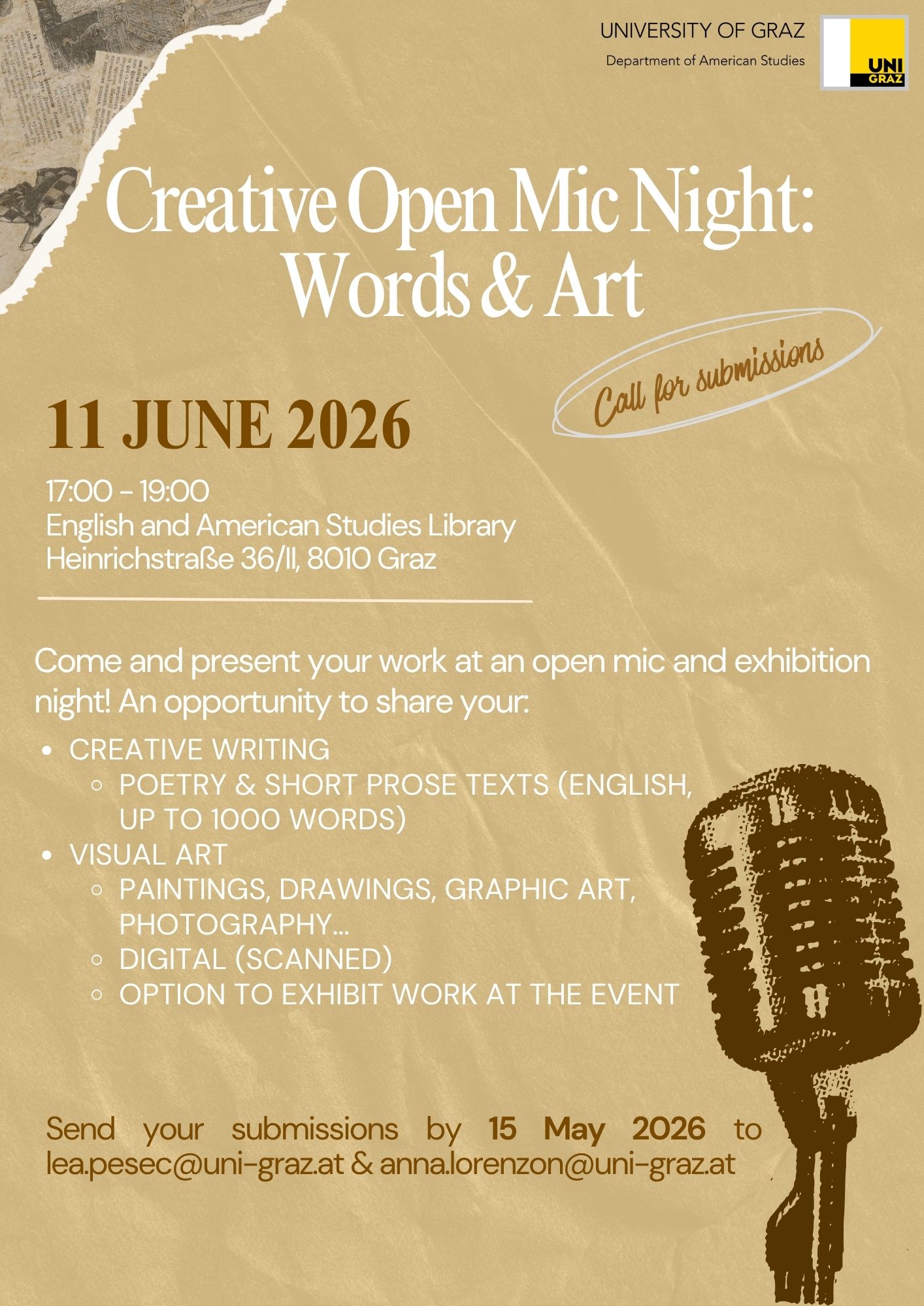 We are excited to invite students, faculty, and staff of the University of Graz to submit their creative work for Creative Open Mic Night: Words & Art, taking place on 11 June 2026, 5:00–7:00 p.m. at the English and American Studies Library (Heinrichstraße 36/II, 8010 Graz).